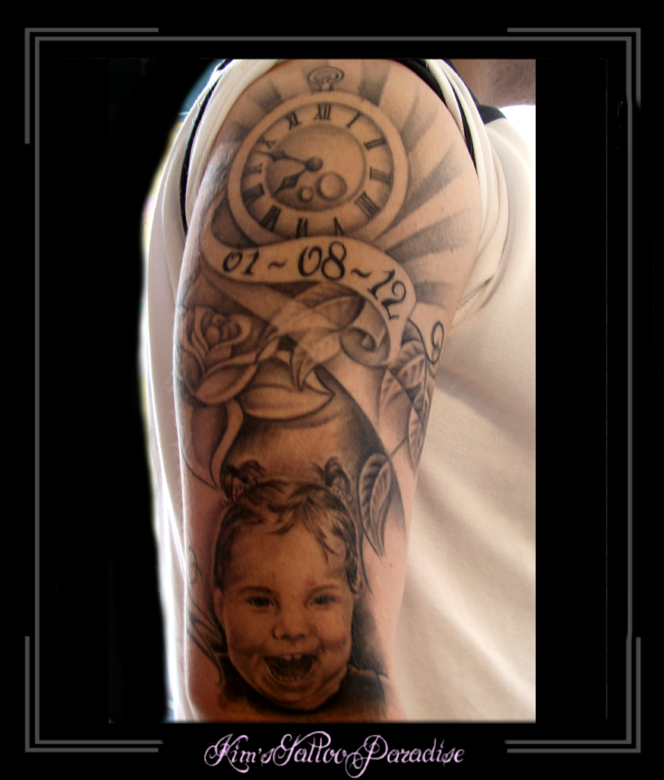 klok en portret 30 augustus 2014 Geef een reactie Tattoo bloem, cijfers, clock, datum, kind, klok, letters, meisje, naam, namen, portret, roos, rozen, stralen