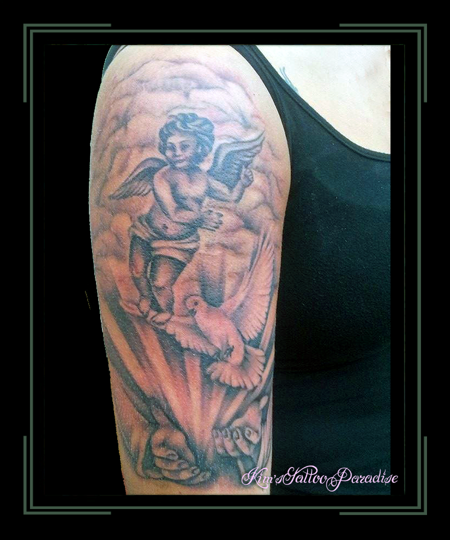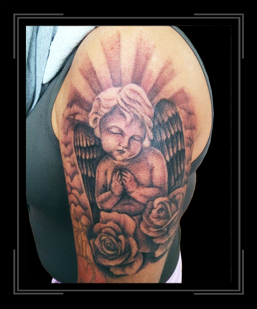 engel met stralen bovenarm 24 december 2014 Geef een reactie Tattoo angel, bloemen, clouds, engel, flower, roses, rozen, stralen, vleugels, wolken, wolkjes
