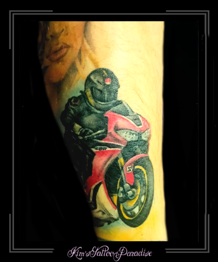 Motor rijder 8 november 2022 Geef een reactie Tattoo helm, kleur, motor, motorpak, motorrijder, onderbeen