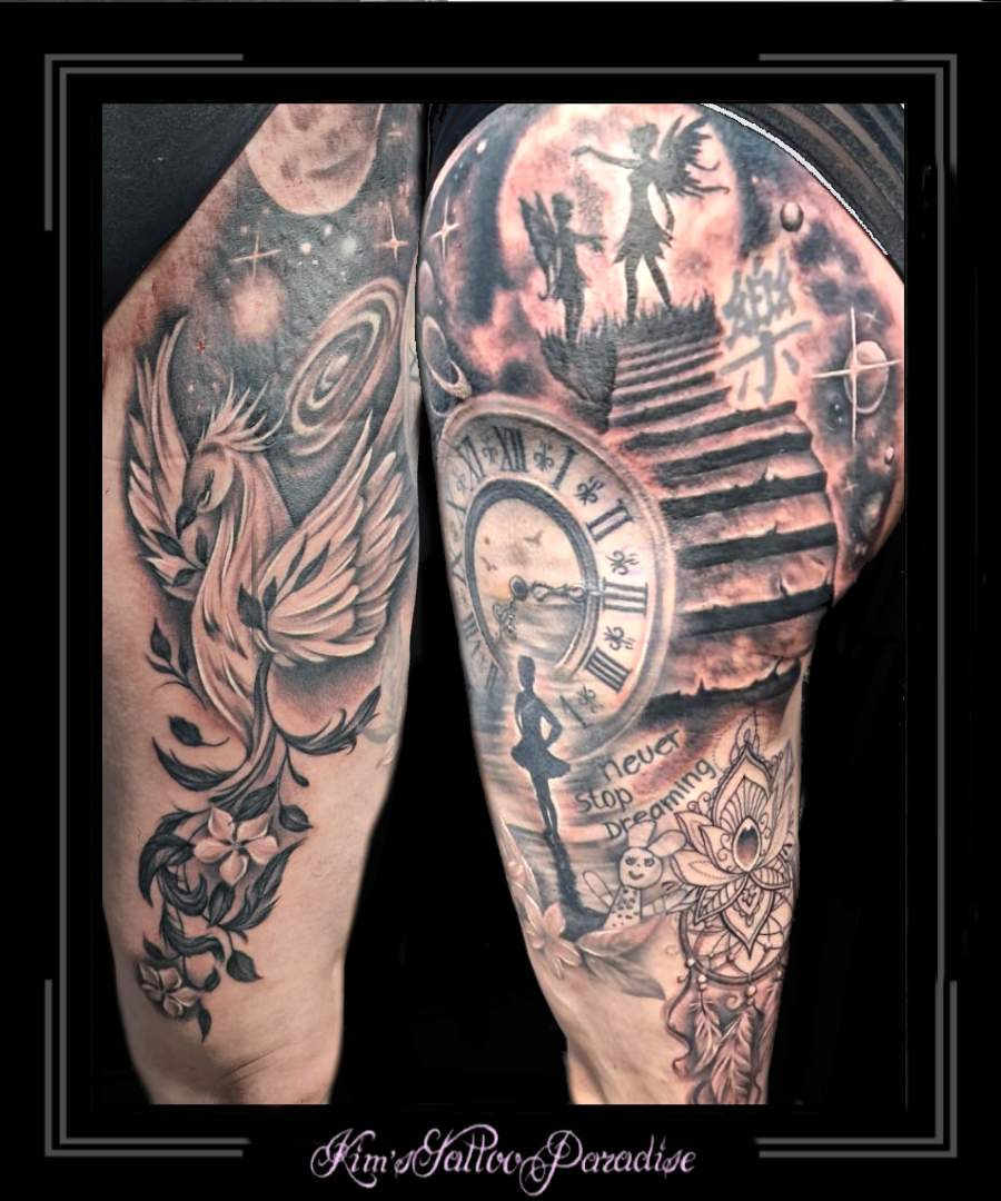 Beensleeve in wording 6 maart 2023 Geef een reactie Tattoo bovenbeen, elfen, klok, lotus, originele tekst, planeten, silhouetten, trap, veren