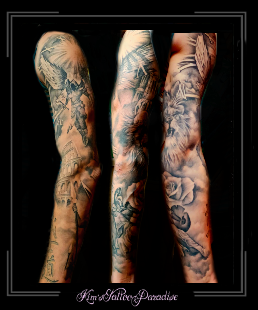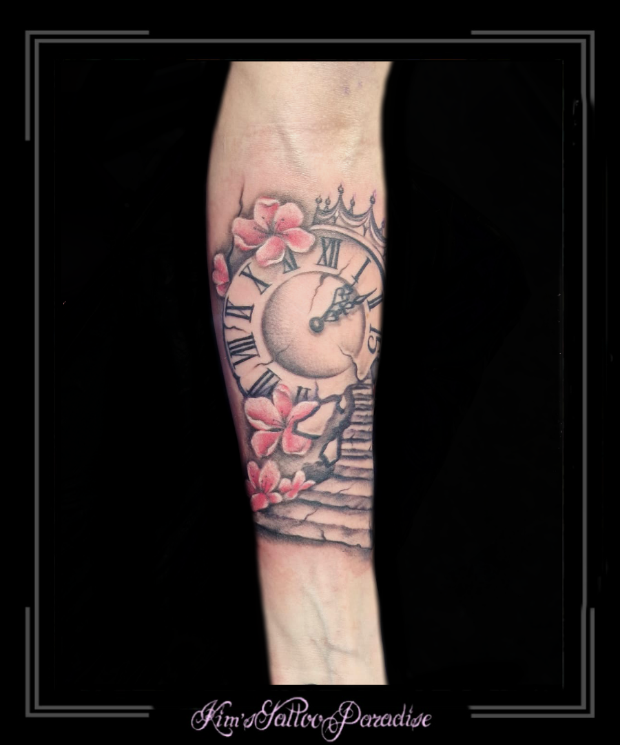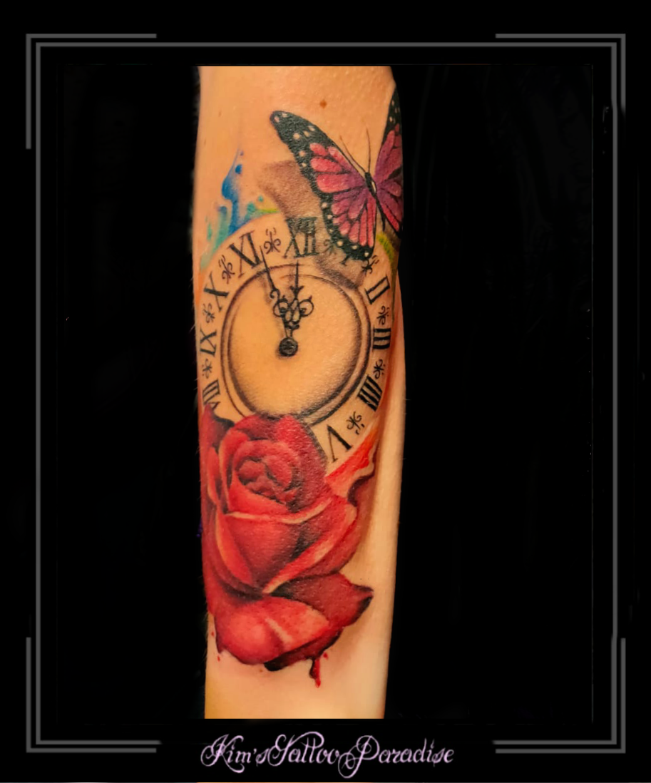 Sleeve 8 augustus 2022 Geef een reactie Tattoo klok, magere hein, romeinse letters, roos, rozen, sleeve, zon
