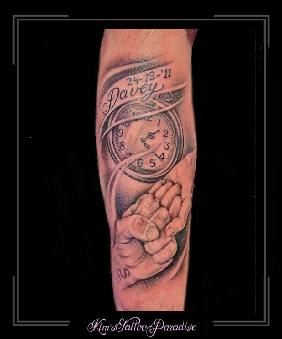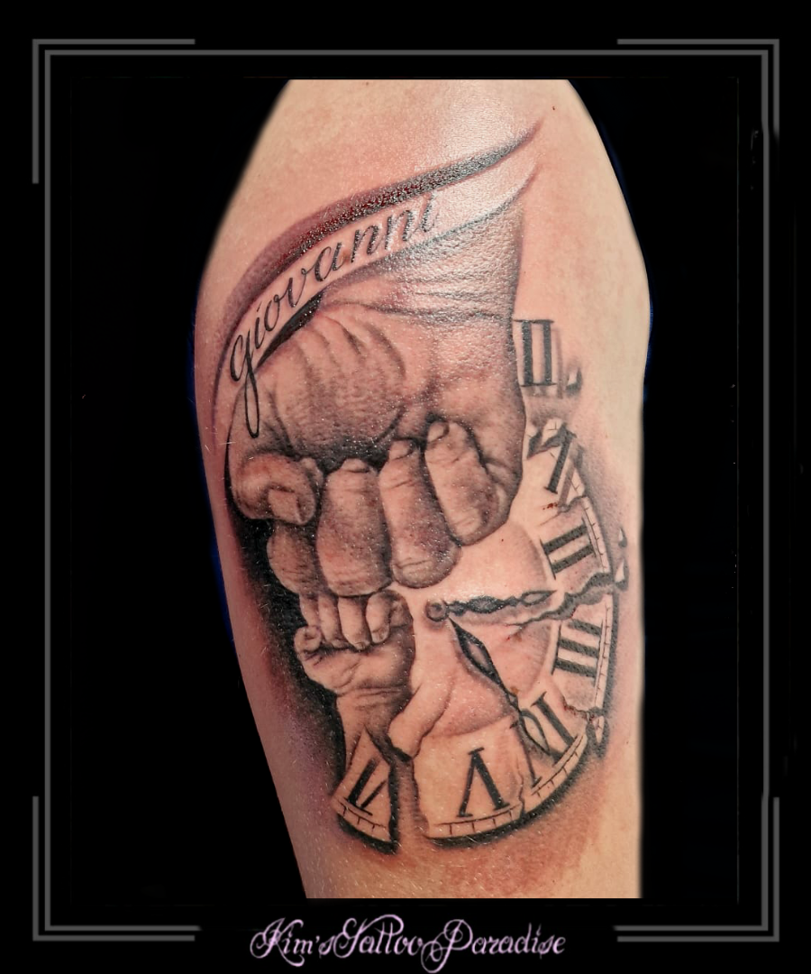 Handen vader en kind 12 juli 2023 Geef een reactie Tattoo baby, bovenarm, familie, family, geboortedatum, hand, handen, kind, klok, liefde, love, naam, vader