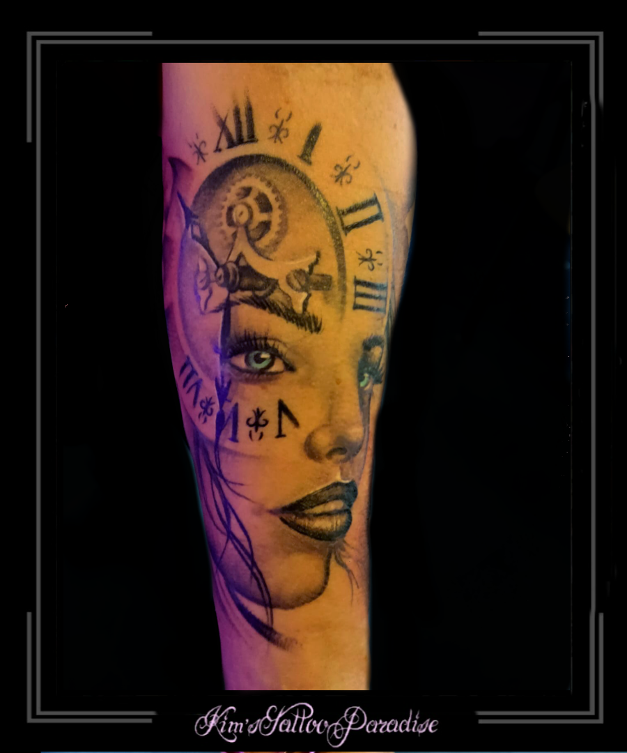Vrouwengezicht met uurwerk 20 maart 2022 Geef een reactie Tattoo klok, onderarm, uurwerk, vrouwengezicht