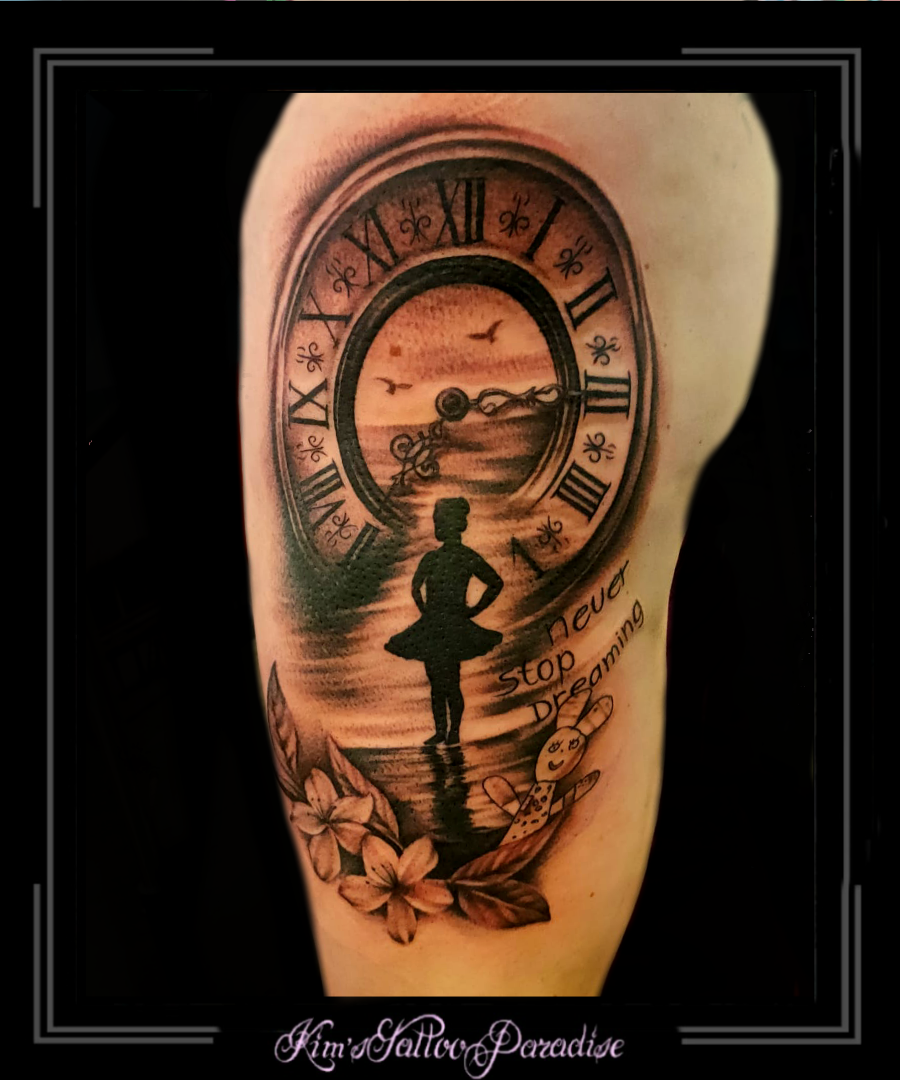 Klok met silhouet 1 mei 2022 Geef een reactie Tattoo blad, dijbeen, klok, popje, silhouet, strand, tekst, vogels