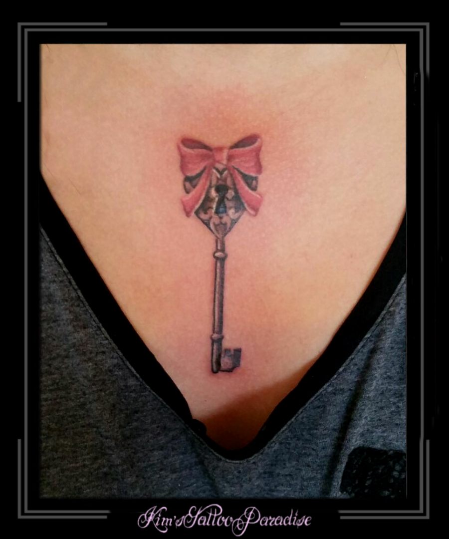sleutel met strik 11 september 2015 Geef een reactie Tattoo borstbeen, brest, color, key, kleur, sleutel, strik