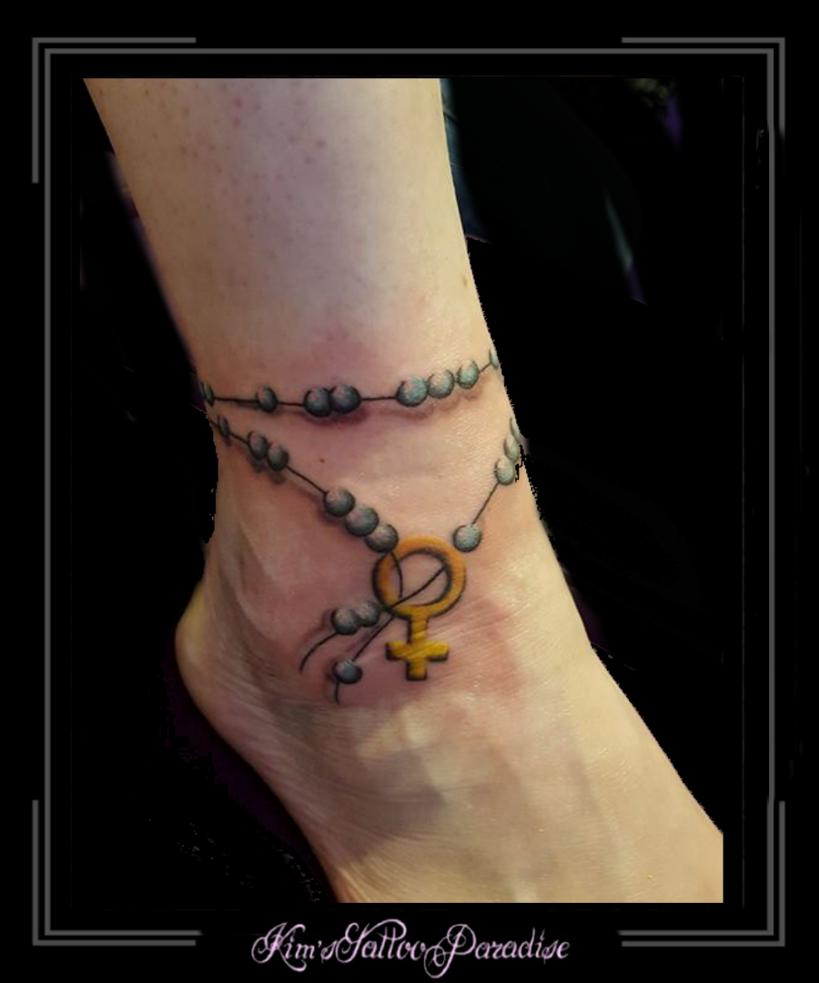 vrouwenteken, enkelband, kralen, ketting, 8 september 2017 Geef een reactie Tattoo enkelband, ketting, kralen, logo, symbol, symbool, voet, vrouwenteken