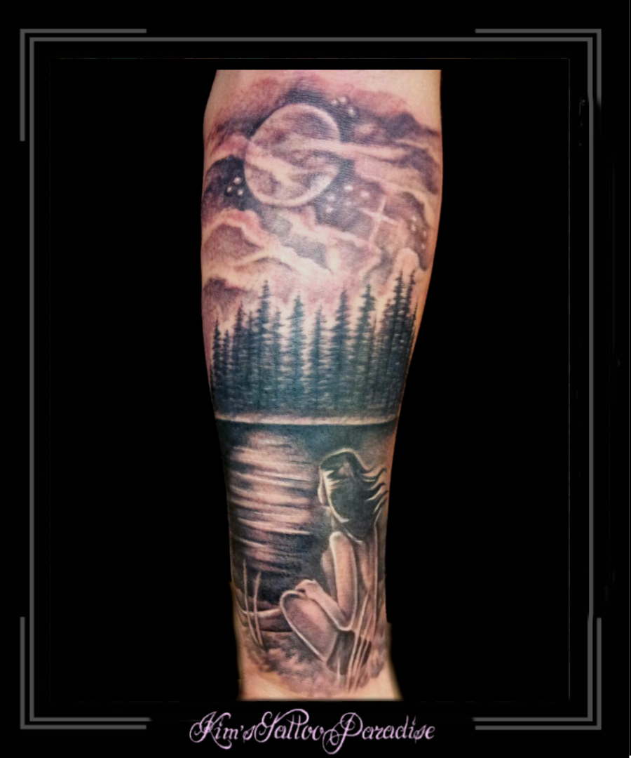 meisje in de maneschijn 24 december 2014 Geef een reactie Tattoo bomen, dennebomen, girl, landscape, landschap, maan, maneschijn, meisje, moon, moonlight, trees, vrouw, water, wolken, woman