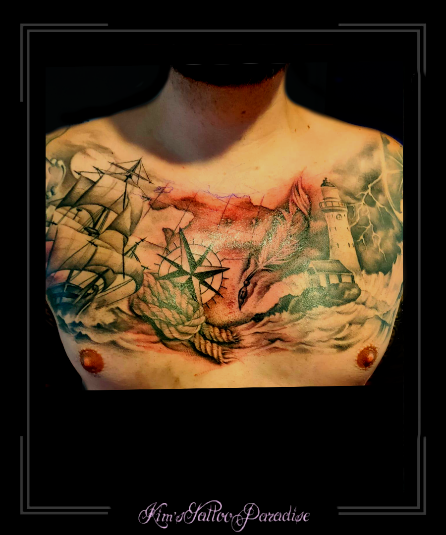 Zeemansborst 22 oktober 2021 Geef een reactie Tattoo borst, golven, inkt, kompas, kotter, landkaart, touw, veer, vuurtoren, zeemansborst, zeilschip