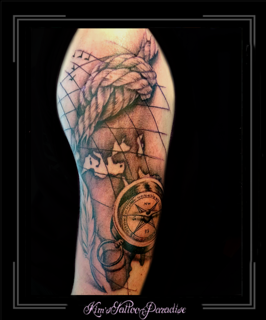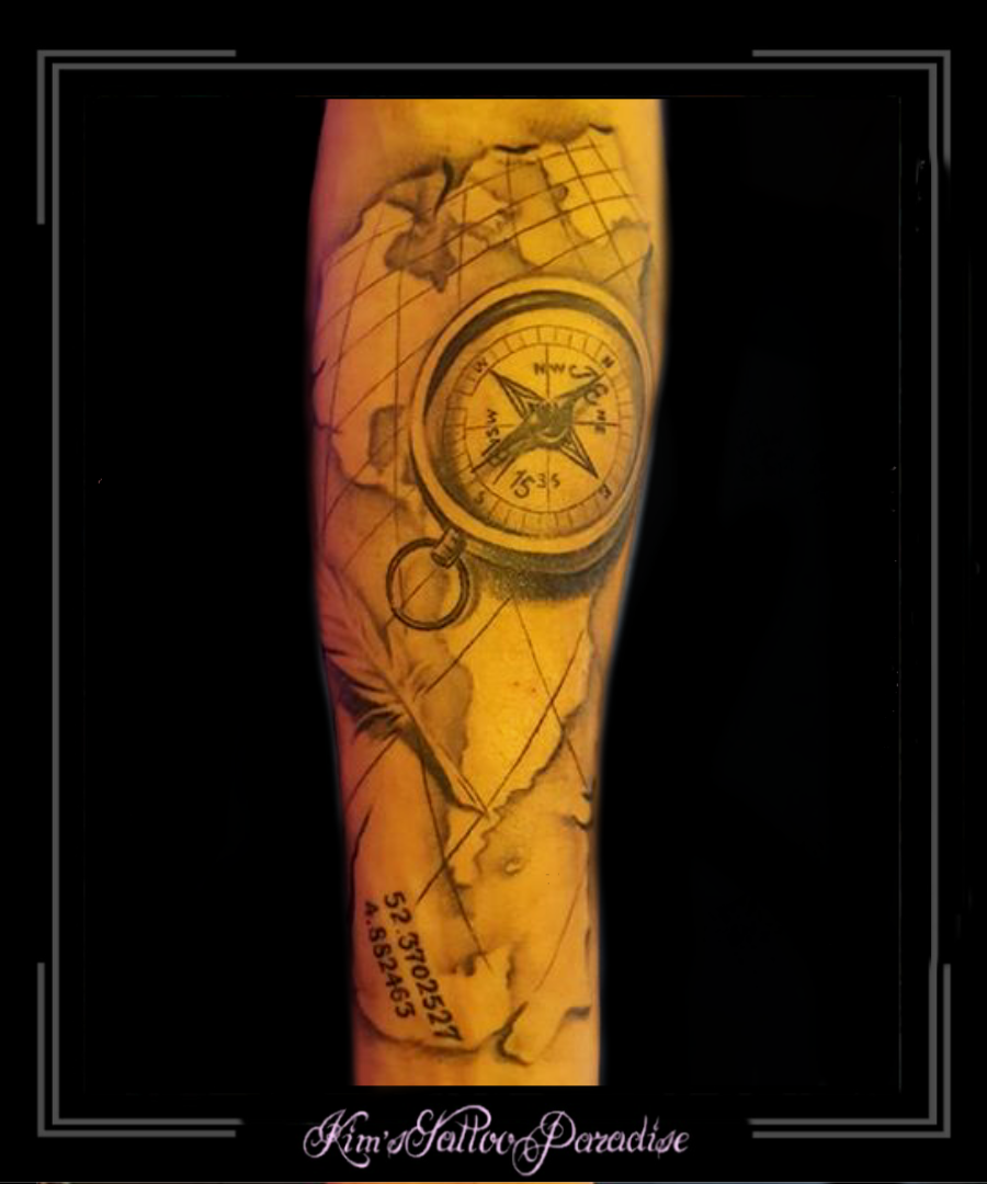 sleeve,kompas,veer,veren,atlas,globe,landkaart,wereldbol,onderarm, 4 maart 2020 Geef een reactie Tattoo atlas, globe, kompas, landkaart, onderarm, veer, veren, wereldbol