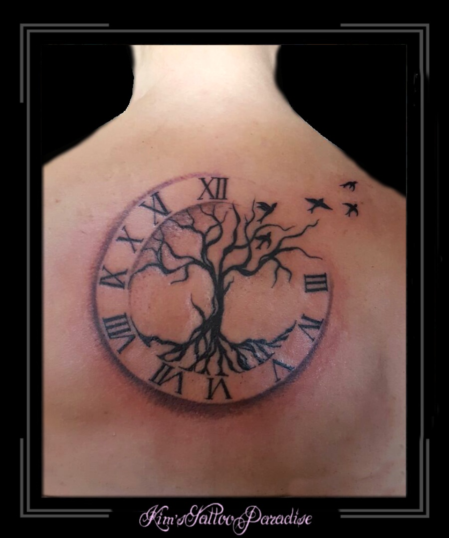 klok en boom rug 9 juni 2016 Geef een reactie Tattoo boom, klok, romeinse cijfers, rug, takken, tijd, vogels, wortels