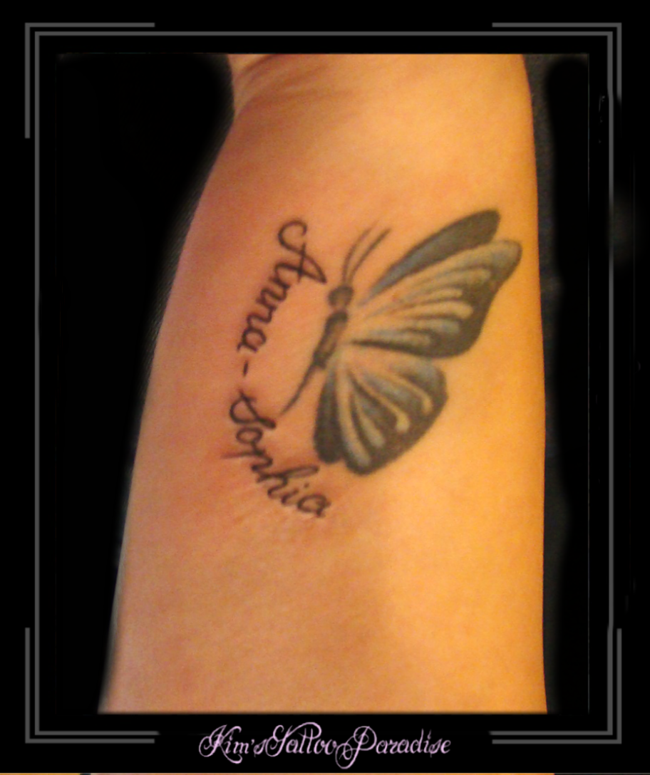 vlinder en naam 14 januari 2015 Geef een reactie Tattoo butterfly, kleur, letters, naam, onderarm, tekst, vlinder
